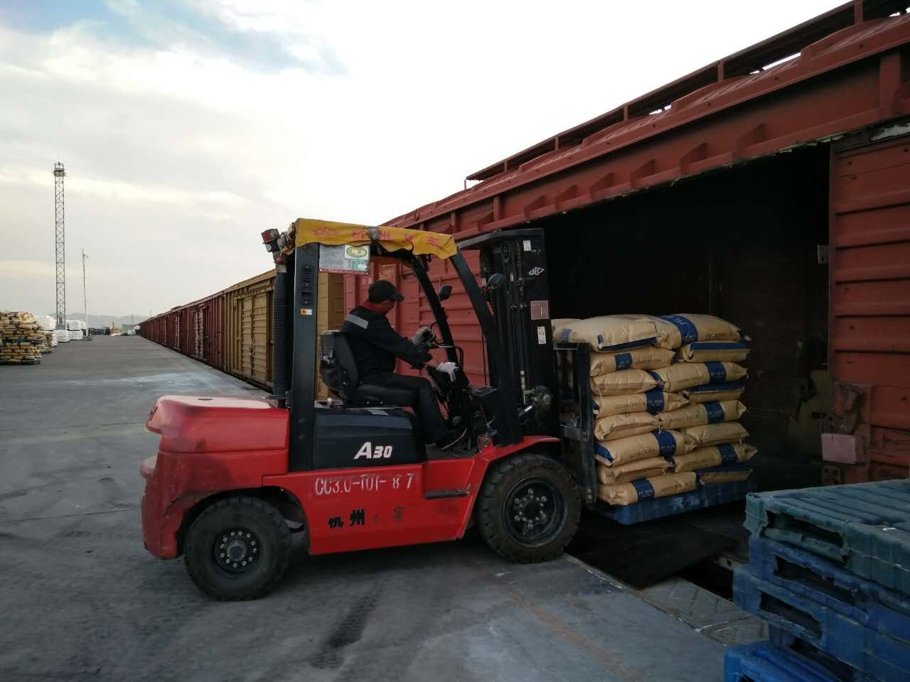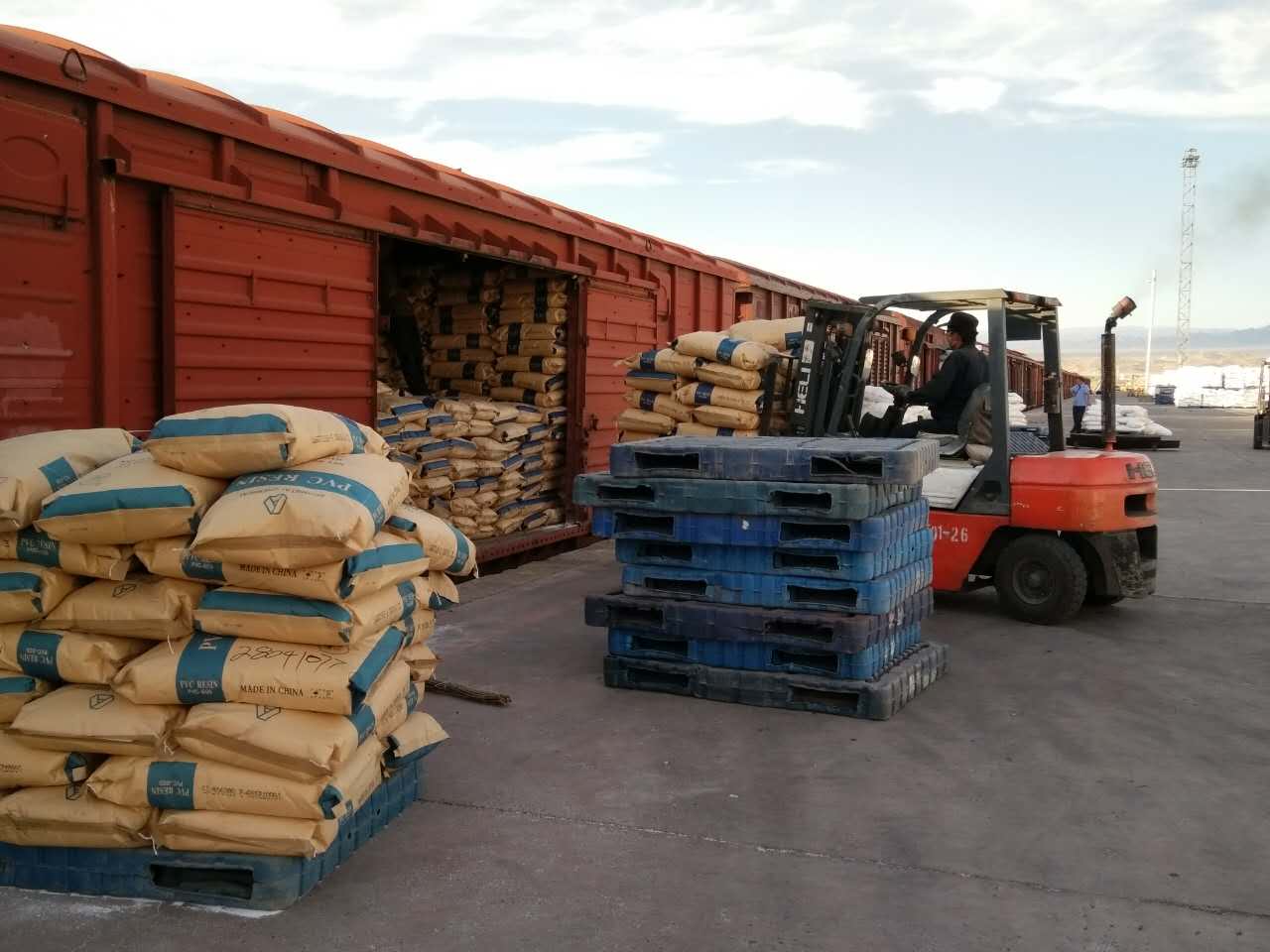 2016年9月9-10日,新疆中泰化學(xué)股份有限公司出口的袋裝聚氯乙烯整列棚車(chē),在阿拉山口綜合保稅區(qū)內(nèi)的地平線(xiàn)鐵路專(zhuān)用線(xiàn)成功裝車(chē)。此次共裝58噸/車(chē)的貨物計(jì)30車(chē)、63噸/車(chē)的貨物計(jì)10車(chē),共40節(jié)哈方車(chē)皮,總重量為2730噸,終到站為烏茲別克斯坦的塔什干站。