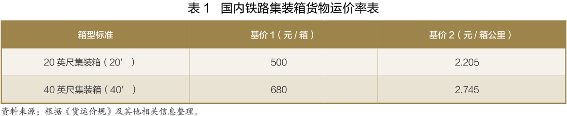 根據(jù)《中華人民共和國鐵道部鐵路貨物運價規(guī)則(鐵運[2005]46號)》(以下簡稱“貨運價規(guī)”)以及國家發(fā)展改革委發(fā)布的關于調(diào)整鐵路貨物運價價格的相關通知文件(《國家發(fā)展改革委關于調(diào)整鐵路貨運價格進一步完善價格形成機制的通知》發(fā)改價格〔2015〕183號),國際鐵路聯(lián)運的國內(nèi)段集裝箱貨物運輸?shù)摹盎鶅r1”(也稱發(fā)到基價)為500元/TEU(20英尺箱)和680元/FEU(40英尺箱),“基價2”(也稱運行基價)為2.205元/TEU*公里和2.754元/FEU*公里(見表1)。集裝箱貨物每箱運費的計算方法為基價1+基價2×運價公里。此外,按照鐵路相關規(guī)定,國際鐵路聯(lián)運的國內(nèi)段運輸,還需要繳納電氣化附加費、新路新價均攤費、鐵路建設基金等費用,由于項目較多且近年來有所調(diào)整,在此不再贅述。值得一提的是,2016年11月,國家發(fā)展改革委發(fā)布《關于清理規(guī)范涉及鐵路貨物運輸有關收費的通知》(發(fā)改價格〔2016〕2498號),要求相關收費主體限期清理規(guī)范鐵路貨物運輸過程中除鐵路運價之外的各種收費,其中涉及鐵路運輸企業(yè)的收費包括鐵路貨物運輸雜費、向?qū)S镁產(chǎn)權或經(jīng)營單位收取的專用線代維修代維護等費用。