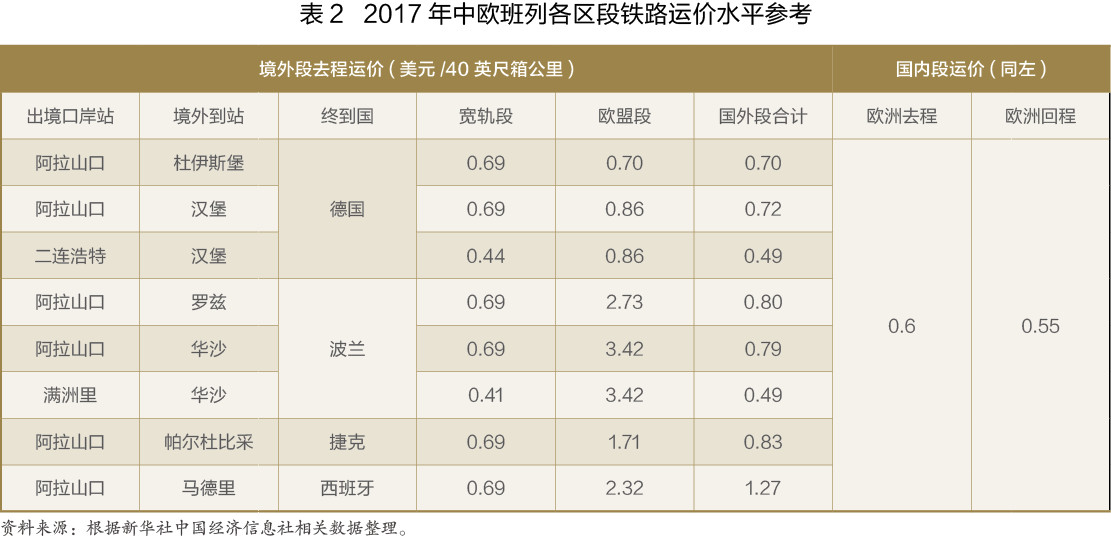 根據(jù)2017年各班列運行線路公布的運價水平,寬軌段的去程平均運價水平大多為0.69美元/大箱公里,經(jīng)二連浩特和滿洲里出境利用西伯利亞大陸橋的運價較低,約為0.4美元/大箱公里;歐盟段的去程平均運價水平差異較大,根據(jù)不同線路走向,從0.7美元/大箱公里至3.42美元/大箱公里不等,高運價率的區(qū)段一般是由于運輸里程較短,固定費用分攤較多所致。國內(nèi)段的去程平均運價水平約在0.6美元/大箱公里,回程平均運價水平約在0.55美元/大箱公里(見表2)。